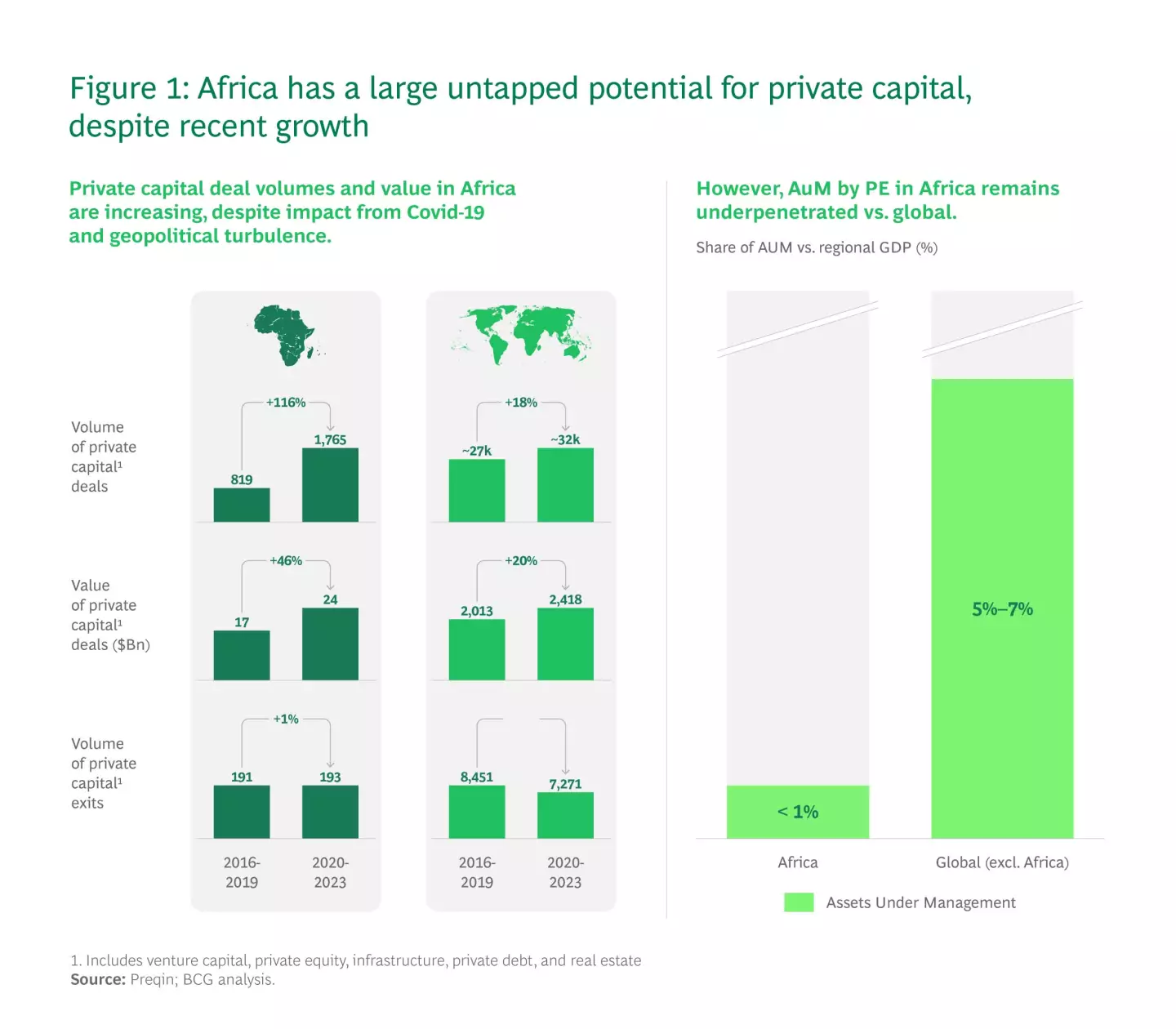 According to a recent report by the Boston Consulting Group (BCG), Africa currently presents significant investment opportunities across several key growth sectors—with private capital deals on the continent growing faster than the global averages in both volume and value, increasing by 116% and 46%, respectively, from 2016 to 2019 and 2020 to 2023. However, assets under management remain relatively low, accounting for less than 1% of GDP, compared to the global average of 5% to 7%, highlighting a considerable potential for expansion.