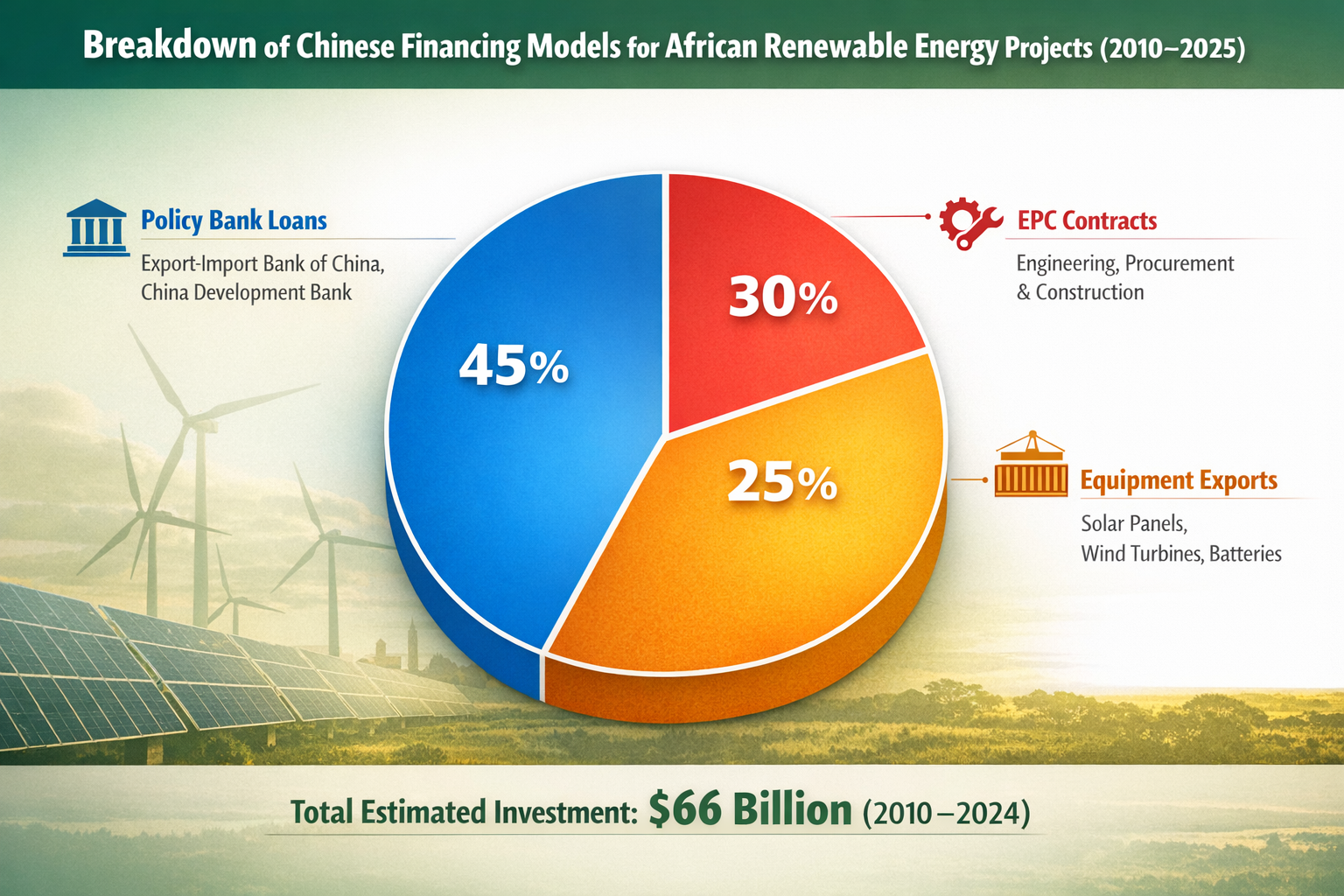 Breakdown of Chinese Financing Models for African Renewable Energy Projects (2010–2025). Data reflects estimated $66 billion in investments via policy bank loans, EPC contracts, and equipment exports. Source: UNCTAD, China Development Bank, African Development Bank