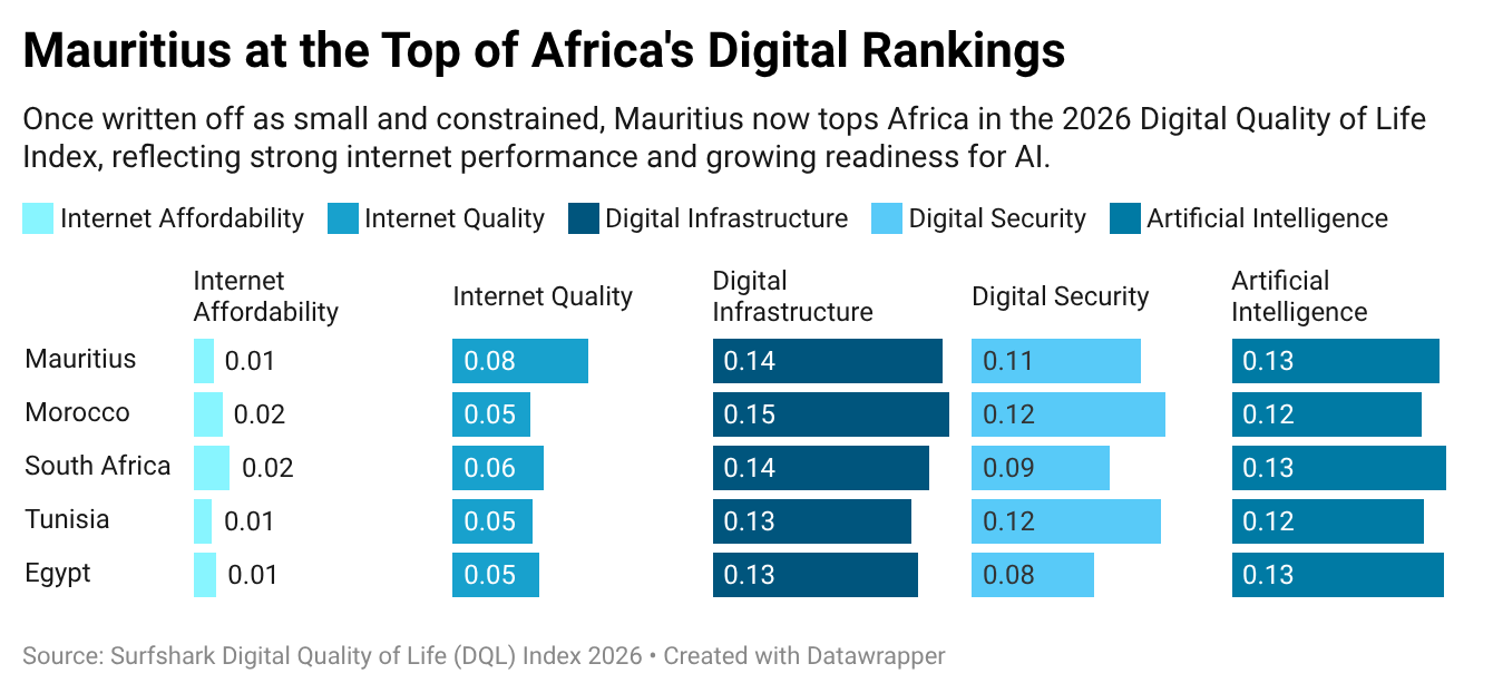 Six decades later, that forecast has been overturned. Mauritius now ranks first in Africa on the Digital Quality of Life Index, outperforming countries many times its size and resource base. It places ahead of Egypt, home to more than 80 million internet users, South Africa, with its globally integrated telecom firms, and other North African economies such as Morocco and Tunisia. Internet penetration exceeds 90 percent, public services are increasingly delivered through digital platforms, and a dense web of submarine cables connects the island directly to Africa, Asia, and Europe.