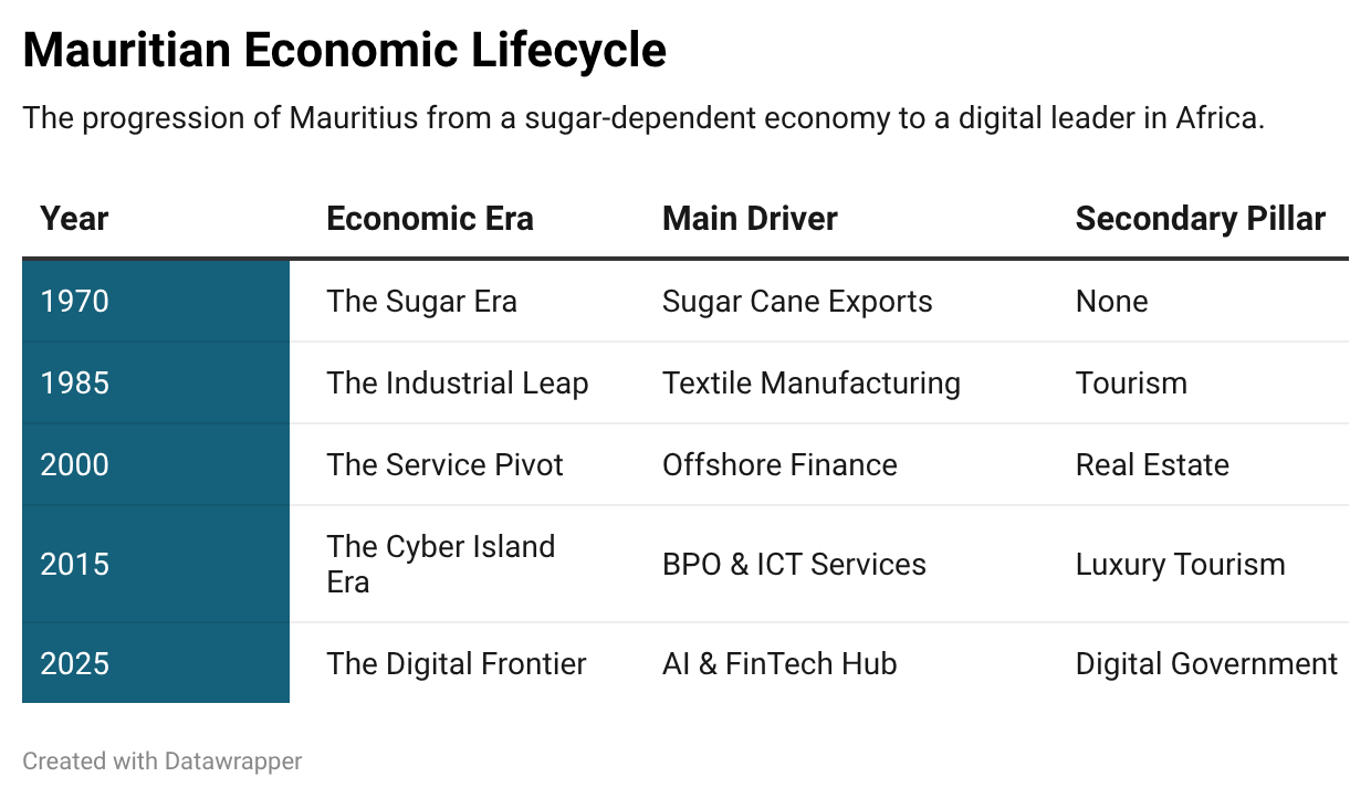 Mauritius’ digital leadership did not emerge in isolation. It is the most recent phase in a long-standing pattern of economic reinvention, one that has shaped the island’s development strategy since independence.