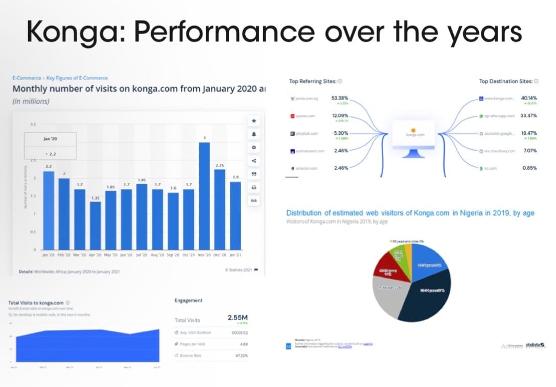 Post‑acquisition diversification continued with the launch of Konga Travel and Tours in March 2019, followed by Konga Health in June 2021, expanding services beyond retail into travel booking and health‑tech distribution. As of 2024, Konga’s ecosystem encompassed six major business verticals, over 200,000 registered merchants, more than three million monthly visits, and over 25 strategically located retail stores across Nigeria, reflecting ongoing growth in both digital and physical commerce channels.