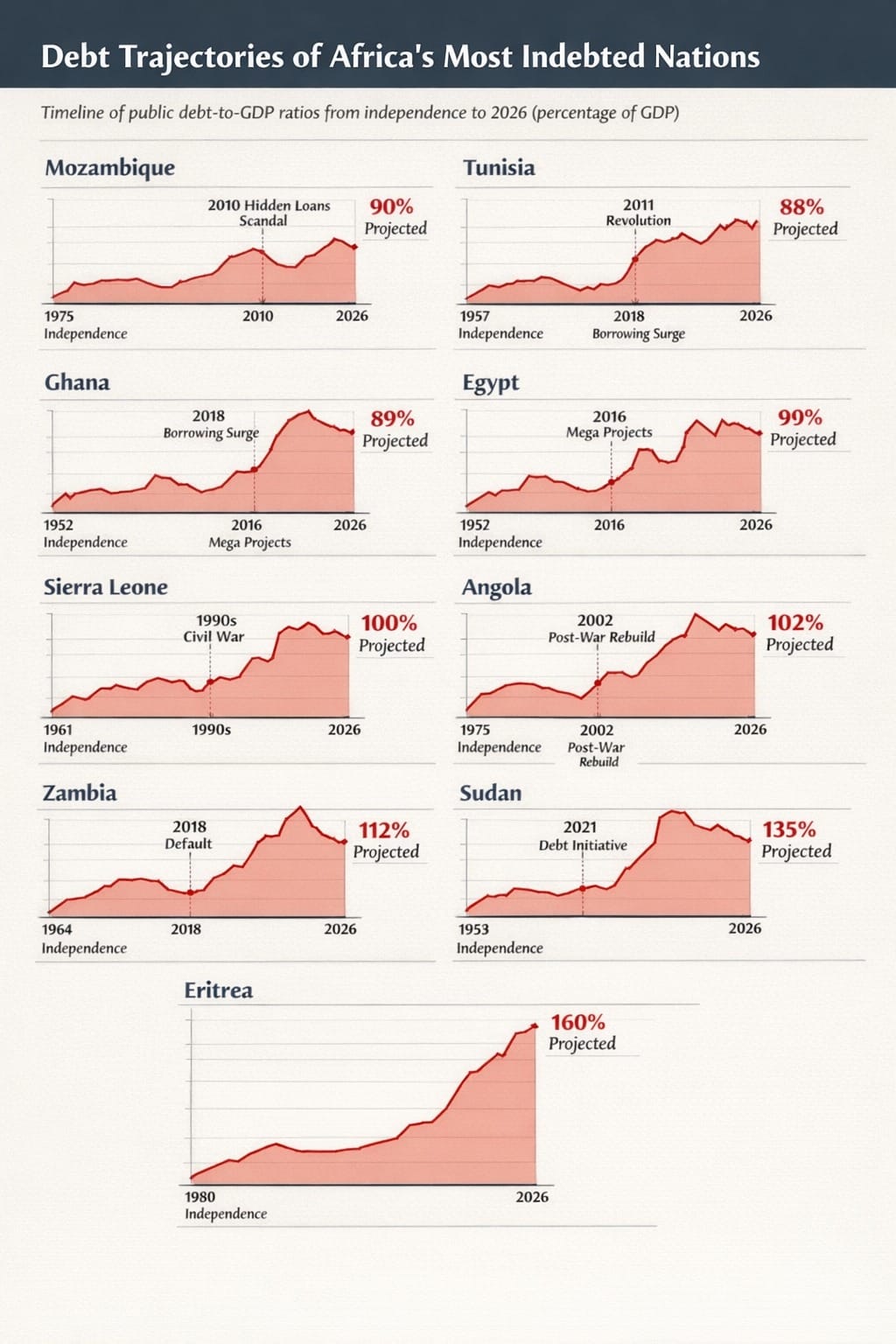 The countries appearing in this list share several traits. Many inherited fragile economic structures at independence, relied heavily on external financing for development, or experienced prolonged political instability, conflict, or repeated commodity shocks. Over time, borrowing intended to support growth gradually accumulated into large debt stocks that now weigh heavily on economic performance.