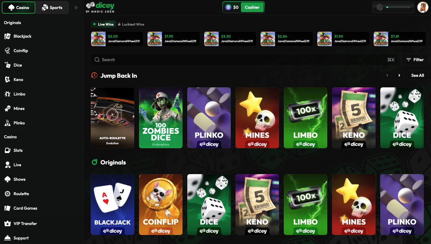 Dicey is a new crypto casino and sportsbook by Magic Eden, a popular NFT marketplace co-founded by Jack Lu.