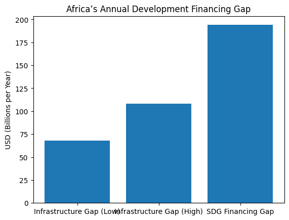 The problem extends beyond infrastructure. To meet the United Nations Sustainable Development Goals (SDGs) by 2030, Africa requires an estimated $194 billion in additional annual financing. Education, healthcare, sanitation, climate adaptation, and digital connectivity all require sustained spending that far exceeds current public revenues.